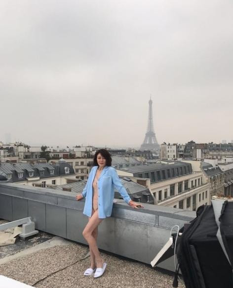 Cô diện bodysuit ôm sát gợi cảm tạo dáng lãng mạn trên ban công một tòa nhà nhìn ra tháp Eiffel.