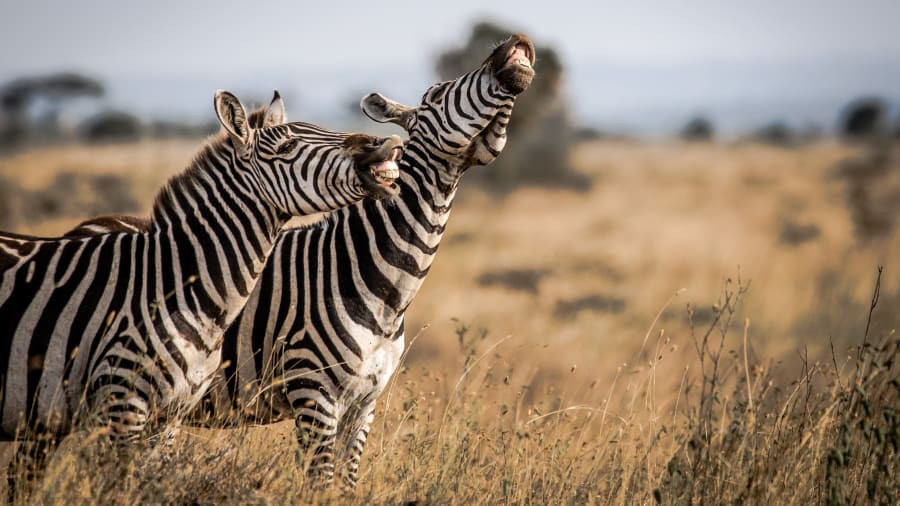 Hai chú ngựa vằn như vừa kể chuyện cười cho nhau nghe, ung dung hưởng thụ cuộc sống ở công viên quốc gia Nairobi của Kenya. Một chú hất cao đầu rất phong cách – phong cách con người. Ảnh: Tanvir Ali.