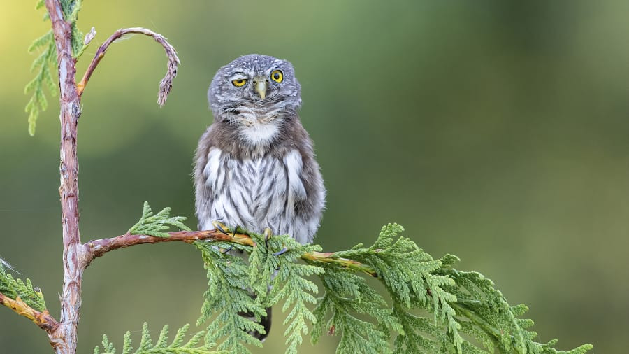 Cú mèo lùn trên đảo Vancouver của Canada đậu trên cạnh cây với vẻ mặt như đang nháy mắt. Ảnh: Anthony Bucci.