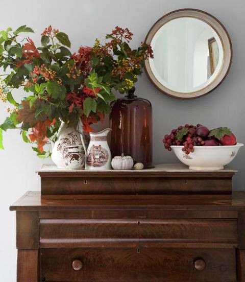 Một chiếc bình cổ cắm cành lá nho trên một chiếc kệ cạnh gương hay gần bậu cửa sổ sẽ mang cả mùa thu vào căn nhà bạn.