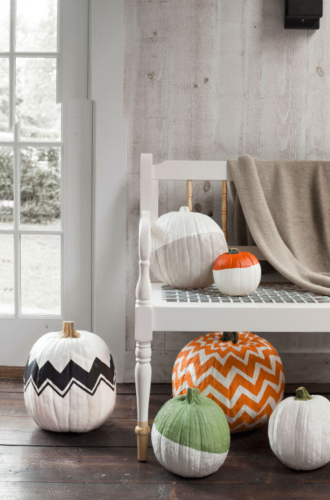Bạn có thể sơn các họa tiết theo mùa sử dụng một cây cọ acrylic và băng dính thợ sơn. Hãy dùng băng dính của thợ sơn gập góc cạnh dán lên quả bí ngô tạo thành các hình đường chéo. Phần còn lại dùng cây cọ sơn lên. Để 30 phút cho khô. Sau đó bỏ lớp băng dính đi. Bạn có thể bày các quả bí ngô già này khắp nhà để tạo vẻ sống động cho căn nhà mùa thu.