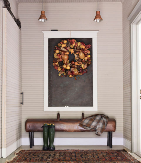 Chiếc ghế cách điệu kiểu yên ngựa ở góc nhà, với vòng nguyệt quế làm từ hoa quả khô theo mùa, hẳn sẽ khiến bạn lâng lâng như thể đang dạo bước trong một cánh rừng lá vàng của mùa thu.