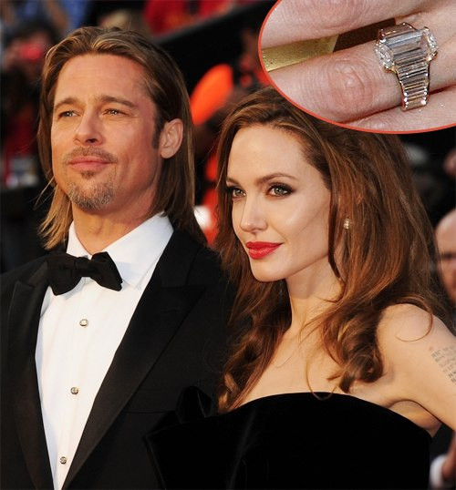 Chiếc nhẫn đính hôn 16 carat của Angelina Jolie có giá khoảng 500.000 USD, gồm 1 viên kim cương 7 carat hình chữ nhật ở giữa và những viên nhỏ tổng cộng 9 carat ở xung quanh.