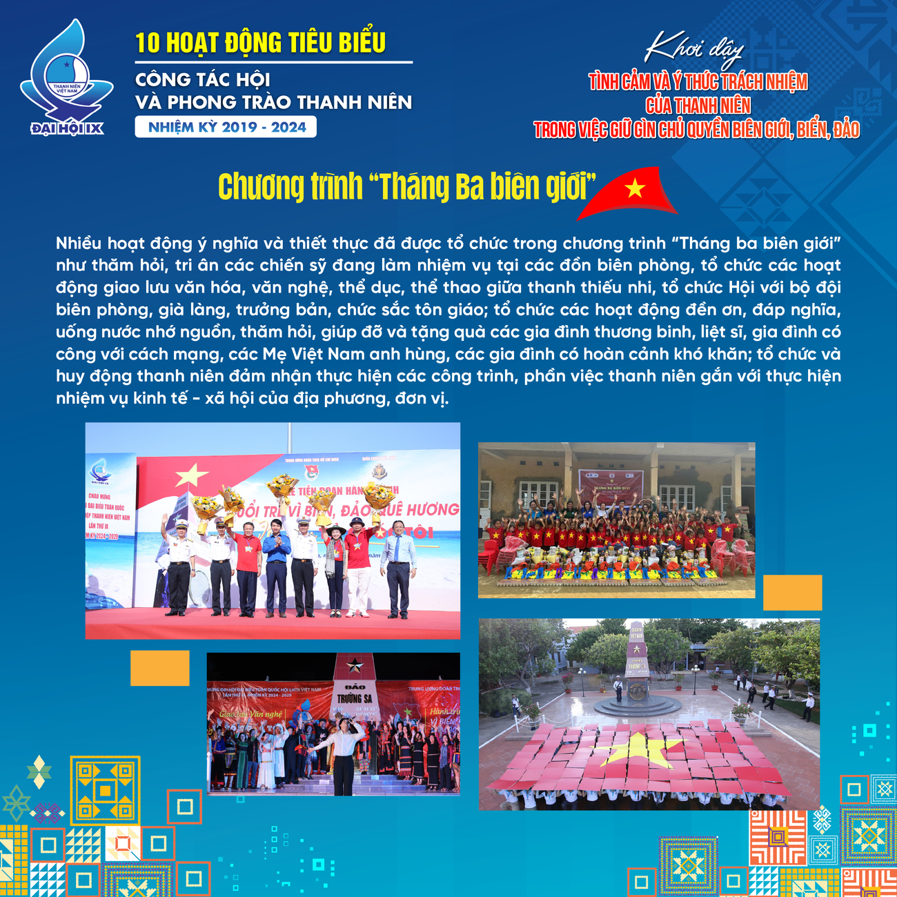 | Trong nhiệm kỳ vừa qua, các cấp bộ Hội trên cả nước đã tổ chức 18.280 hoạt động hướng về biên giới, biển, đảo thu hút sự tham gia của gần 2,5 triệu lượt hội viên, thanh niên. |