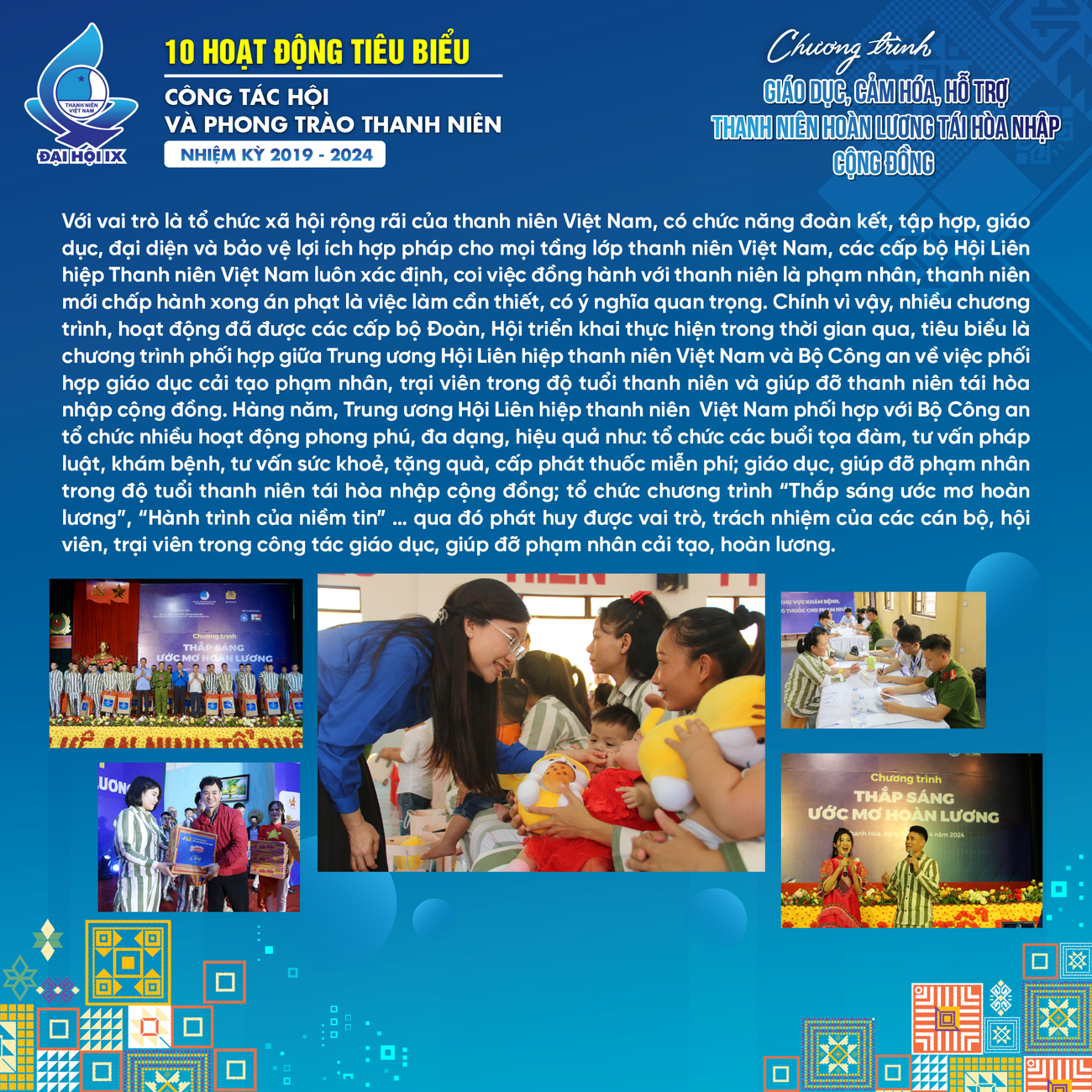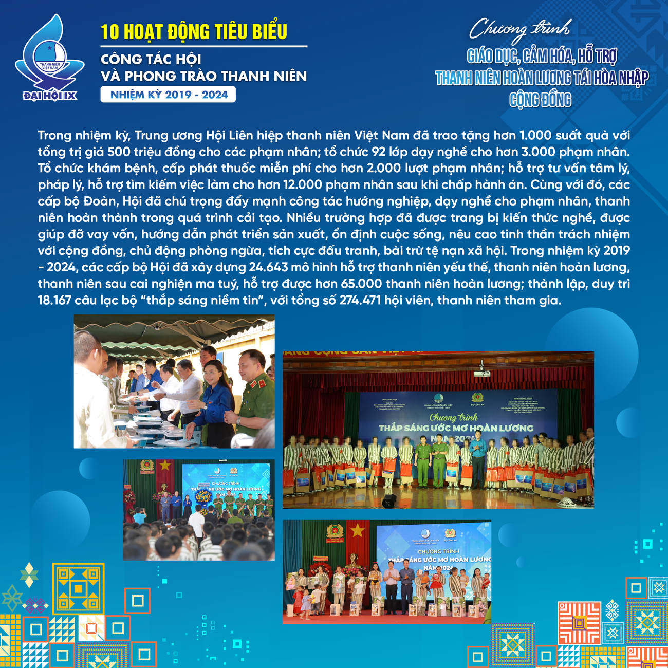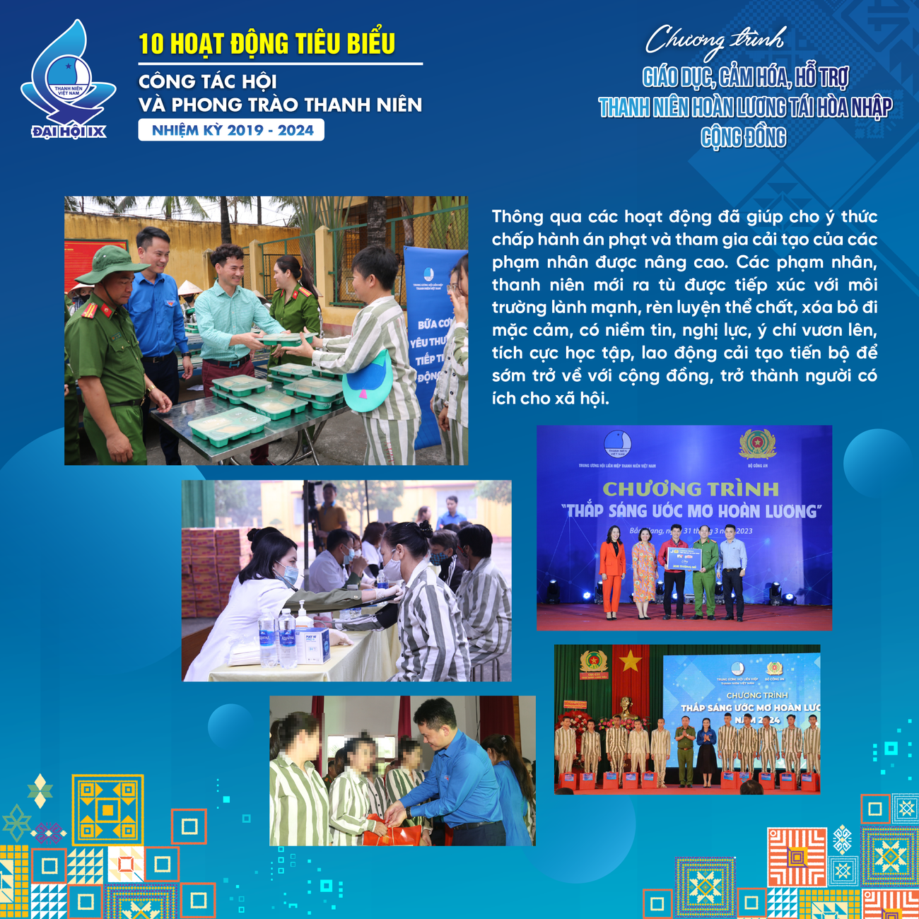 | 10. Chương trình giáo dục, cảm hóa, hỗ trợ thanh niên hoàn lương tái hòa nhập cộng đồng. |