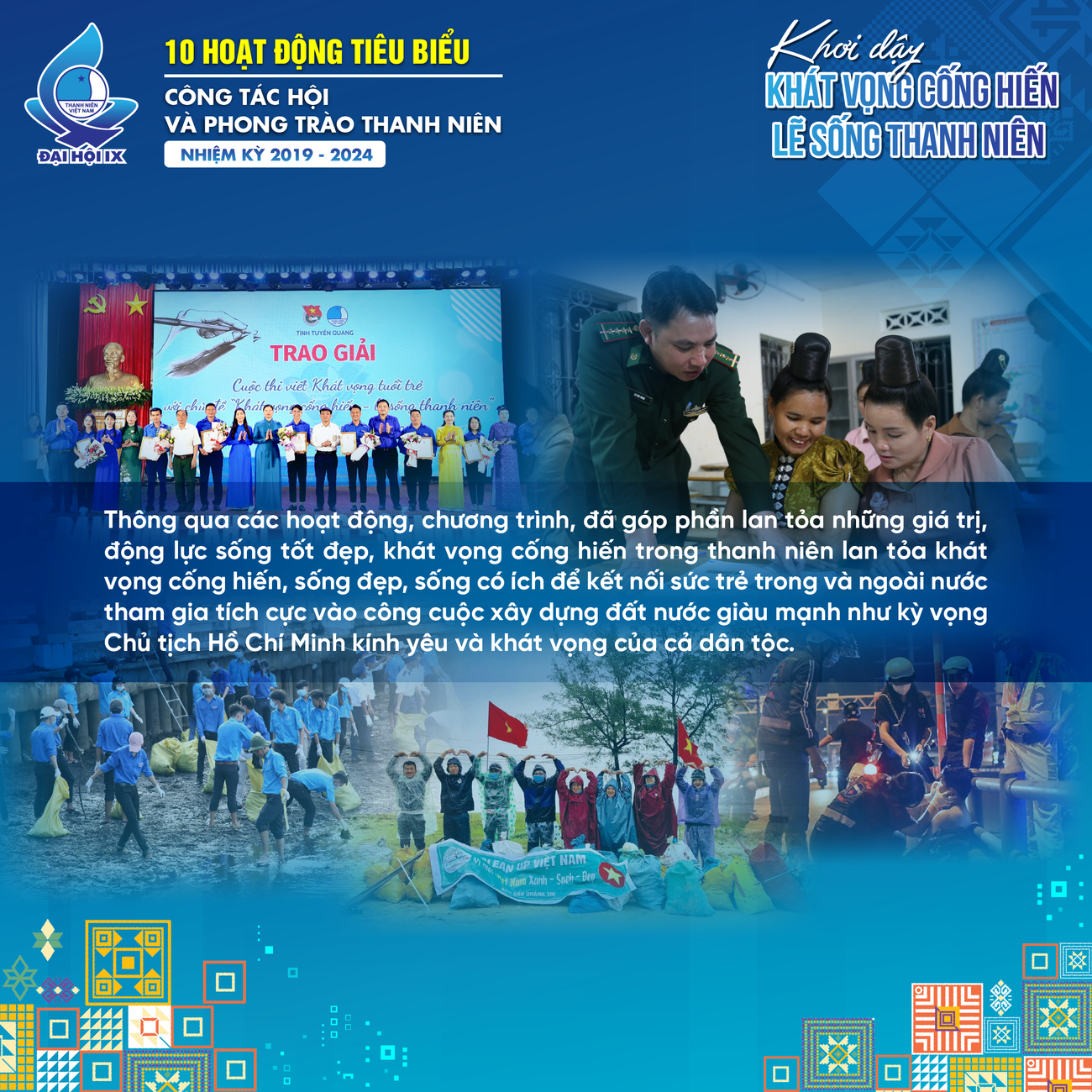 TPO - Khơi dậy khát vọng cống hiến – lẽ sống thanh niên; Khơi dậy tình cảm và ý thức trách nhiệm của thanh niên trong giữ gìn chủ quyền biên giới, biển đảo; Thanh niên tham gia bảo tồn, phát huy giá trị văn hóa truyền thống dân tộc; Khơi dậy khát vọng khởi nghiệp, lập nghiệp trong thanh niên… là những hoạt động tiêu biểu của công tác Hội LHTN Việt Nam và phong trào thanh niên nhiệm kỳ 2019 – 2024.