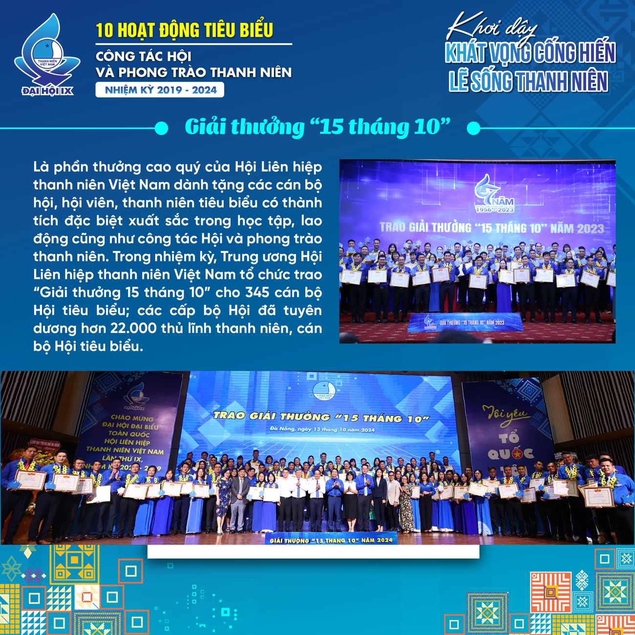 | Nhiều chương trình, hoạt động mang ý nghĩa nhân văn sâu sắc được tổ chức thường xuyên, sâu rộng nhằm lan tỏa những giá trị, động lực sống tốt đẹp, sống có ích, sống trách nhiệm, sống sẻ chia trong thanh niên như: Giải thưởng “Thanh niên sống đẹp”; Chương trình “Chia sẻ cùng thầy cô”, chương trình “Gia đình trẻ tiêu biểu”, Giải thưởng “15 tháng 10”... |