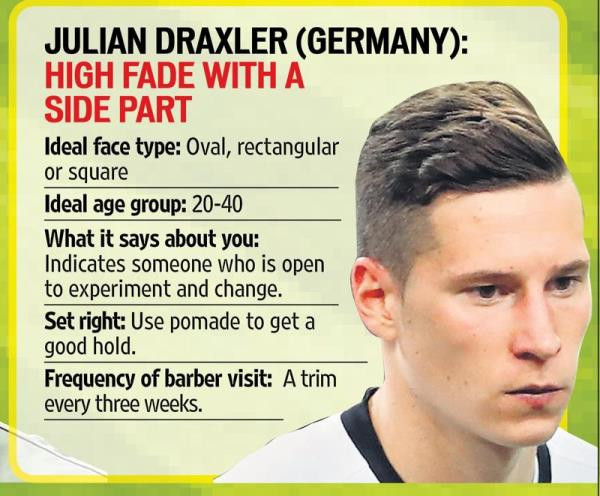 Tóc High Fade chải lệch về một bên là kiểu được Julian Draxler lựa chọn. Những chàng trai chọn kiểu tóc này thường là những người cởi mở, không ngại thay đổi. So với kiểu tóc của Ronaldo, kiểu tóc này đỡ công chăm sóc hơn. Thông thường phải tới salon khoảng 3 tuần mỗi lần.