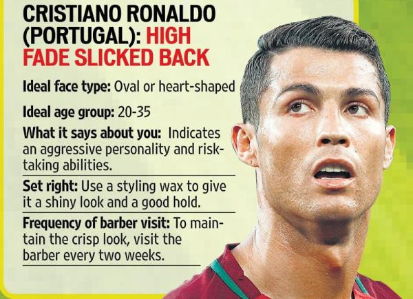 Tóc High Fade chải về phía sau: Ronaldo là đại diện của kiểu tóc này tại EURO. Kiểu tóc này thường được những chàng trai có cá tính mạnh lựa chọn. Để giữ nếp, thường xuyên phải sử dụng gel tạo kiểu và tất nhiên phải tới salon tóc 2 tuần mỗi lần để được chăm sóc.