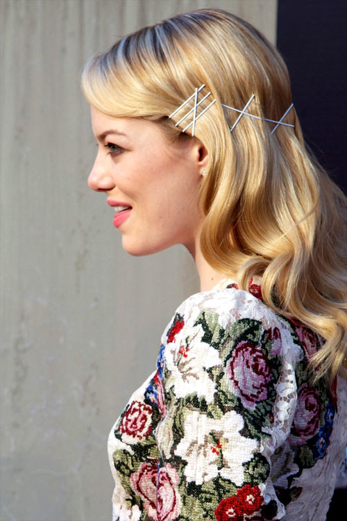 Cô nàng ngọt ngào Emma Stone tỏa sáng khi áp dụng phương pháp đan chéo kẹp ghim màu trắng tinh khôi ton-sur-ton với sắc nền của váy áo.