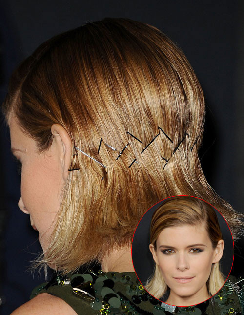 Người đẹp phim Transcendence Kate Mara nhận được nhiều lời khen ngợi về gu làm đẹp khéo léo bởi style đan chéo những chiếc kẹp ghim đen tạo sự nổi bật tương phản trên màu tóc vàng. Nữ diễn viên toát lên vẻ cá tính, sành đệu khi sấy đuôi tóc vểnh ra nhằm đem đến cảm giác gương mặt đầy đặn hơn.