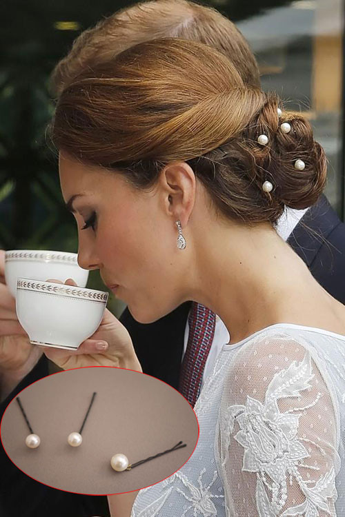 Nếu yêu thích sự sang trọng, chị em nên thử style tóc búi đính ngọc trai quý phái giống công nương Anh Kate Middleton. Thậm chí, bạn có thể tự chế phụ kiện xinh xắn này bằng cách dùng dây thép mảnh đính hạt ngọc trai vào đầu chiếc kẹp tăm.