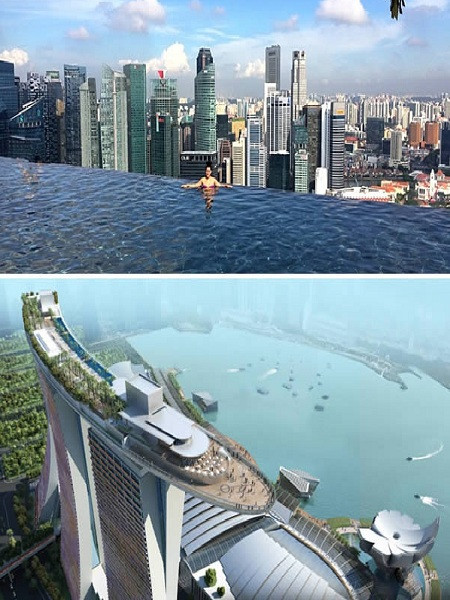 Khách sạn Marina Bay Sands ở Singapore bao gồm ba tòa tháp, một cấu trúc giống chiếc thuyền khổng lồ ở trên cùng (tầng 57) và một hồ bơi nhìn bao quát toàn bộ khu trung tâm Central District. Khách sạn này do Moshe Safdie, kiến trúc sư mang hai dòng máu Israel và Canada, thiết kế.
