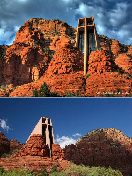 Nằm giữa những gò đá đỏ ở Sedona, Arizona, Holy Cross là nhà thờ Thiên Chúa giáo được xây dựng vào năm 1956. Nhà thờ này được xây trên hai ngọn núi nhọn cao 76 m và nhô ra ngoài bức tường đá trên 300 m.