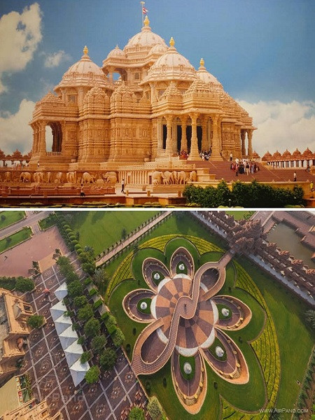 Đền Akshardham ở New Delhi nằm trên diện tích hơn 8.000 m2 trên bờ sông Yamuna. Ngôi đền bằng đá cẩm thạch và sa thạch này hoàn toàn không sử dụng vật liệu thép trong quá trình xây dựng. 3.000 tình nguyện viên cùng với 7.000 thợ thủ công đã góp sức xây nên đền thờ Akshardham, và ngôi đền mở cửa lần đầu tiên vào năm 2005.