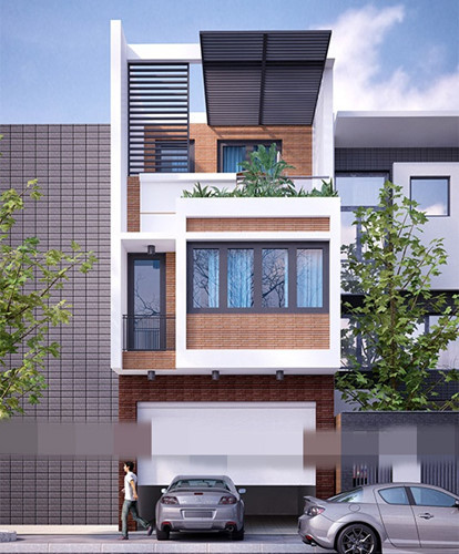 Mẫu nhà ống 3 tầng gác lửng hiện đại kết hợp cây xanh thoáng mát.