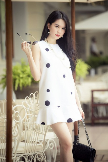 Ngọc Trinh gây ấn tượng với vẻ trẻ trung của chiếc đầm loe có điểm xuyết chấm bi xinh xắn.