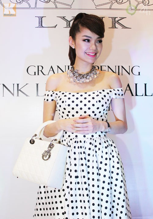 Thanh Hằng đẹp thanh lịch với họa tiết chấm bi nổi bật trên nền satin kết hợp cùng kiểu váy thiết kế trang nhã.