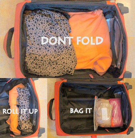 Những người yêu du lịch hay kể cả dân phượt đều đồng ý rằng cuộn quần áo lại sẽ tốn ít diện tích hơn là gấp chúng. Hơn nữa cuộn quần áo lại cũng giúp cho quần áo đỡ bị nhàu hơn so với gấp, vì khi gấp sẽ để lại nhiều nếp gấp trên quần áo.