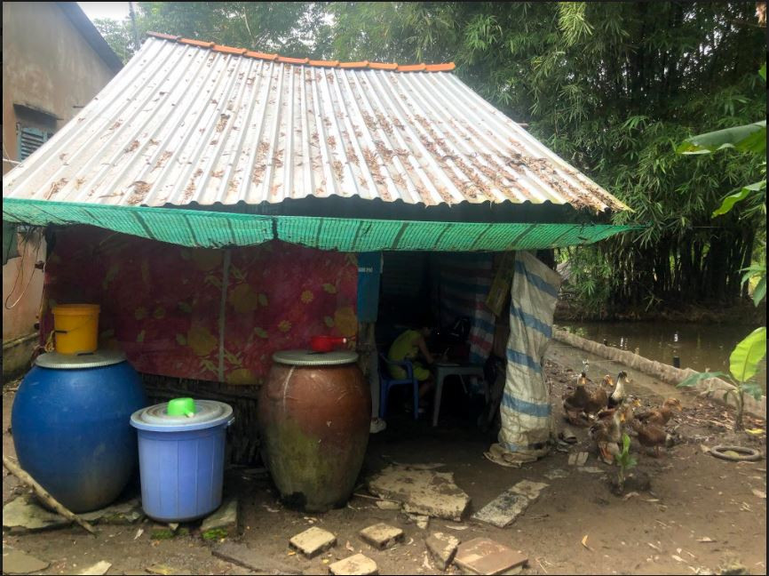 “Gọi là nhà nhưng nó chỉ lớn cái chòi vịt xíu thôi”, cha nó - anh Nguyễn Văn Nam cười. “Ban đầu còn không có đường để đi đâu Sau này, người dân muốn ra đồng nhiều nên đắp bờ cao thêm, mình được thể có cái dẫn vào đến tận trong nhà”.