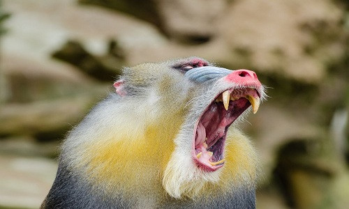 Khỉ mặt chó Mandrill có khuôn mặt nhiều màu sắc trông như một chú hề, nhưng khi chúng mở miệng, những chiếc răng nanh lớn, dài nhọn dữ tợn của con đực khiến cả loài báo cũng phải dè chừng. Ảnh: Flickr.