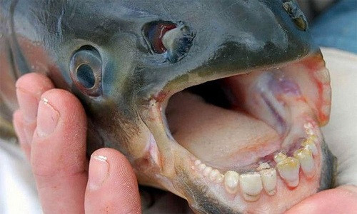 Những chiếc răng dạng khối, thẳng của cá pacu dễ khiến nhiều người nhầm lẫn với hàm răng con người. Thuộc họ cá nước ngọt Nam Mỹ phân bố ở lưu vực sông Amazon, cá pacu có họ hàng với cá piranha ăn thịt. Tuy nhiên, cá pacu thường sử dụng hàm răng khỏe để nghiền các loại hạt rơi xuống nước. Ảnh: Wikimedia Commons.