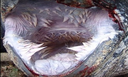 Cá mút đá myxin (hagfish) là một trong số những loài có bộ hàm kỳ lạ nhất. Chúng sở hữu hàm răng kép với những chiếc răng nhọn hoắt, xếp dày như răng lược, thực hiện hoàn hảo chức năng xé thịt. Cá mút đá myxin thường chui vào bên trong con mồi và ăn từ trong ra ngoài. Ảnh: Ocean Treasures memorial library.