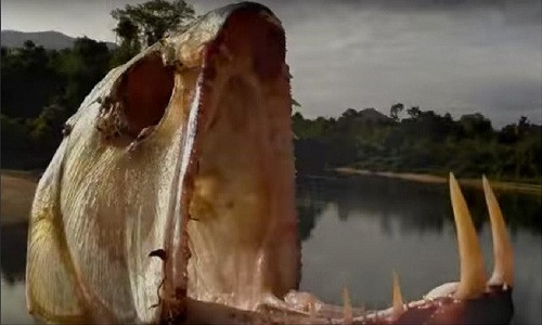 Cá ma cà rồng payara sở hữu hai chiếc răng nanh dài tới 15 cm nhô ra từ hàm dưới, dùng để đâm xuyên con mồi. Cấu tạo đặc biệt ở hộp sọ với hai hố ở hàm trên cho phép cá payara giấu kín răng nanh trong khoang miệng và ngăn chúng tự đâm mình. Ảnh: YouTube.