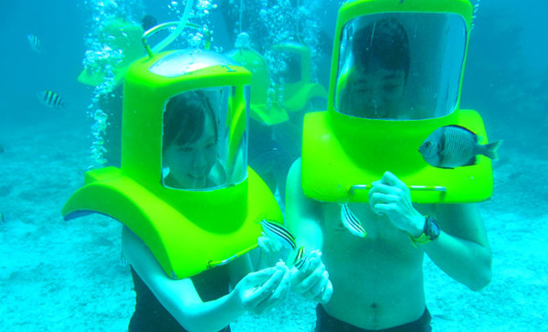 Về cơ bản, trò này không khác với lặn biển là mấy nhưng nó mang đến cho bạn sự thoải mái khi bạn không phải đeo những bình hơi nặng cùng bộ quần áo chuyên dụng. Chỉ cần một chiếc mũ bảo hiểm lớn, trong suốt được nối với bình dưỡng khí trên thuyền là bạn có thể tự do đi lại dưới đáy biển và tha hồ nhìn ngắm khung cảnh tuyệt đẹp của thế giới thủy sinh.