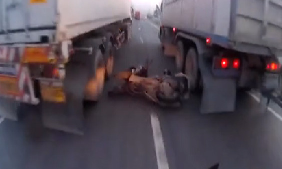 Thoát chết trong gang tấc dưới hai làn bánh xe tải (XEM VIDEO)