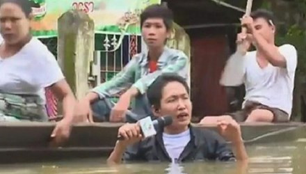 Phóng viên đằm mình dưới dòng nước lũ để đưa tin gây sốt (XEM VIDEO)