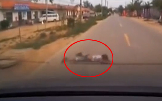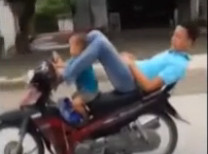 Nam thanh niên nằm ngửa, chở em bé lái xe bằng chân (XEM VIDEO)