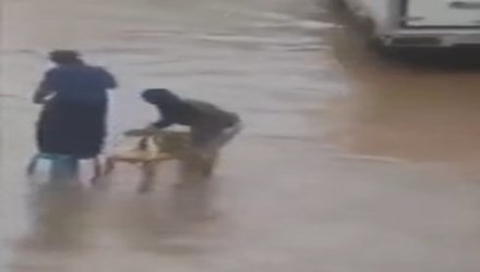 Chồng lội nước bì bõm bắc ghế cho vợ qua đường ngập (XEM VIDEO)