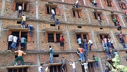 Phụ huynh và người thân thí sinh bất chấp nguy hiểm để leo lên tầng cao ném tài liệu cho con em mình tại một điểm thi ở quận Vaishali, bang Bihar. Ảnh: Hindustan Times.