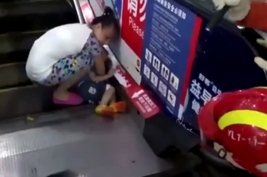 Nghẹt thở giải cứu bé trai bị kẹt tay vào thang cuốn (XEM CLIP)