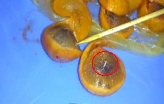 Giòi lúc nhúc trong quả sấu dầm ở Hà Nội. Ảnh cắt từ video.