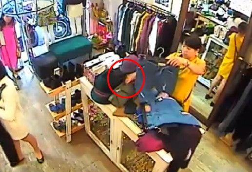 'Nữ tặc' móc trộm iphone trong cửa hàng quần áo. Ảnh cắt từ video.