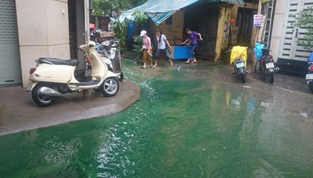 Cận cảnh ngõ phố Hà Nội ngập nước màu xanh kỳ lạ (XEM VIDEO)