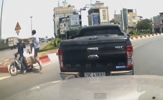 Tài xế ôtô đạp người đi xe máy văng khỏi xe vì bị tạt đầu (XEM VIDEO)