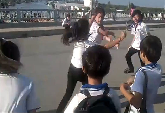 Hai nữ sinh đánh nhau trên cầu, bạn bè hò reo cổ vũ (XEM VIDEO)