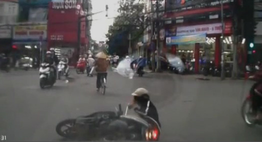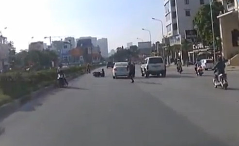 Cô gái ngã văng khỏi xe máy vì tạt đầu ôtô (XEM VIDEO)