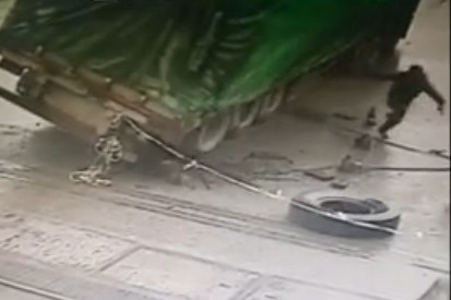 Thợ sửa xe kịp chạy thoát khi xe tải đổ (XEM VIDEO)