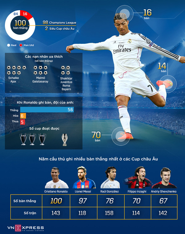 Cristiano Ronaldo chỉ ghi được 16 bàn thời còn khoác áo Man Utd, nhưng bùng nổ từ khi sang Real Madrid để trở thành cầu thủ đầu tiên đạt mốc 100 bàn.