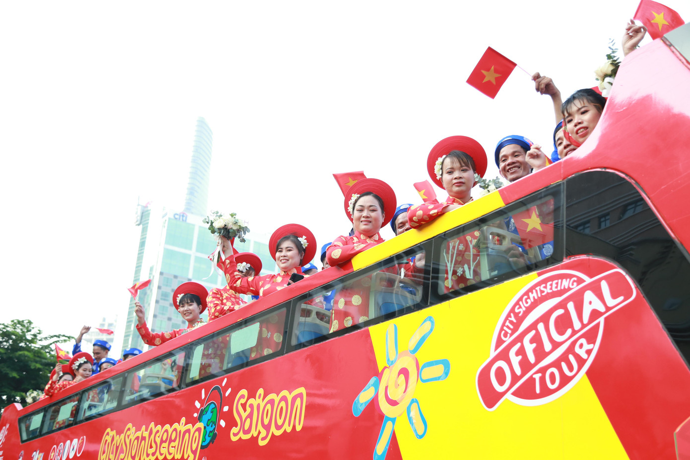 | Sau khi dâng hoa Tượng đài Chủ tịch Hồ Chí Minh và đón nhận những món quà lưu niệm của chương trình, các đôi cùng lên xe buýt hai tầng diễu hành từ trung tâm TPHCM đến Trung tâm Hội nghị tiệc cưới Long Biên Palace (quận Gò Vấp) để thực hiện các nghi thức của lễ cưới truyền thống. |