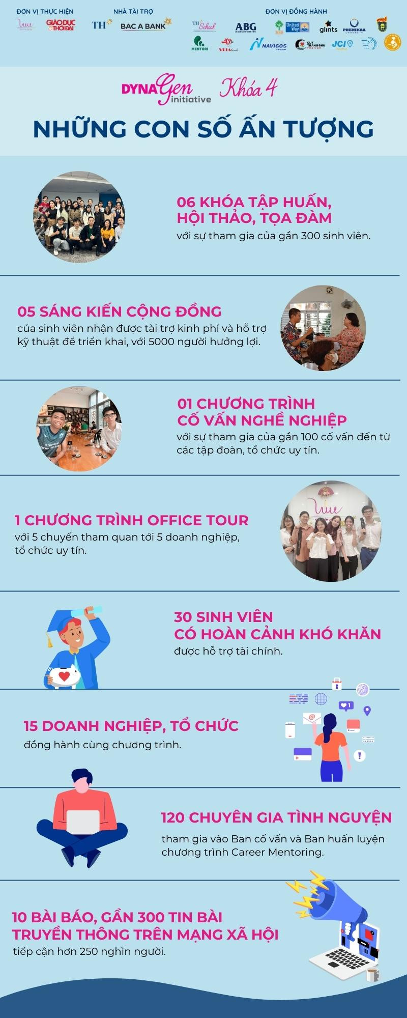 Với những nỗ lực không ngừng để mang đến những cơ hội tốt nhất cho sinh viên, DynaGen Initiative mùa thứ 4 đã khép lại với những con số cực kì ấn tượng: với tổng số 10 hoạt động được triển khai; 300 sinh viên đã tham gia trực tiếp các hoạt động huấn luyện; 30 sinh viên có hoàn cảnh khó khăn được hỗ trợ tài chính; 120 chuyên gia tình nguyện, 15 doanh nghiệp, tổ chức đồng hành cùng chương trình; 5 sáng kiến cộng đồng của sinh viên được tài trợ. Qua đó, nâng tổng số người hưởng lợi trực tiếp từ chương trình lên 1.000 người và 10.000 người hưởng lợi gián tiếp từ các hoạt động truyền thông.