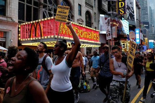 Tại New York, hàng trăm người biểu tình xuống đường, làm tắc nghẽn giao thông tại Quảng trường Times ở trung tâm Manhattan với khẩu hiệu: “Giơ tay lên, không bắn”.