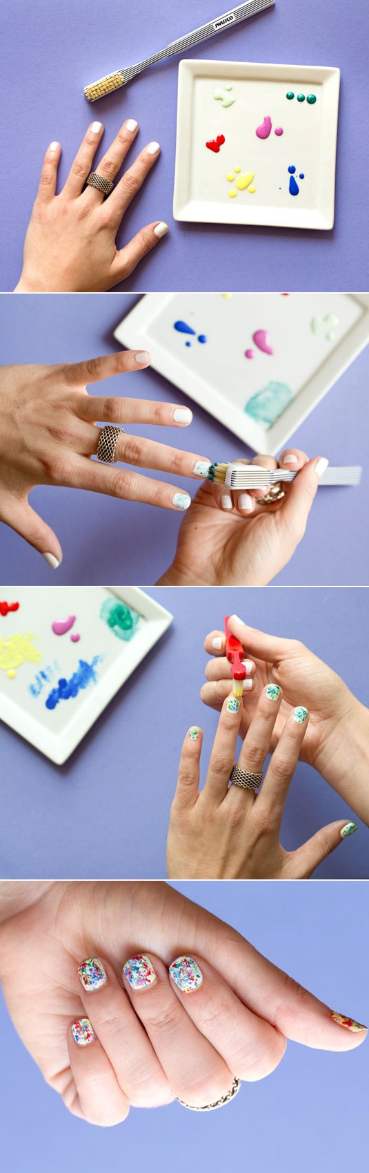 9. Tạo kiểu móng nghệ thuật độc đáo: Dùng bàn chải đánh răng và các màu sơn móng tay mà bạn thích. Đổ sơn móng tay vào một chiếc đĩa giấy, chấm đầu lông bàn chải đánh răng lên sơn móng tay, sau đó bạn chấm chấm ngẫu hứng lên móng. Tiếp tục làm tương tự với những chiếc bàn chải đánh răng khác và những màu sơn khác. Dùng nước rửa móng để làm sạch bàn chải đánh răng.