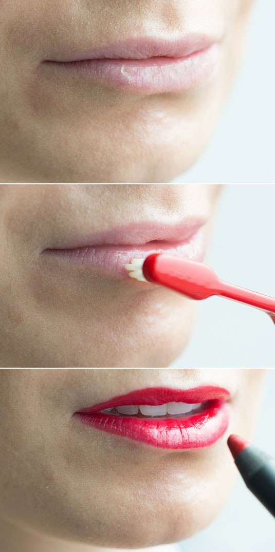 4. Tẩy tế bào chết trên môi: Bôi son dưỡng môi sau đó dùng bàn chải chải theo hình vòng tròn trên môi để tẩy đi các tế bào chết.