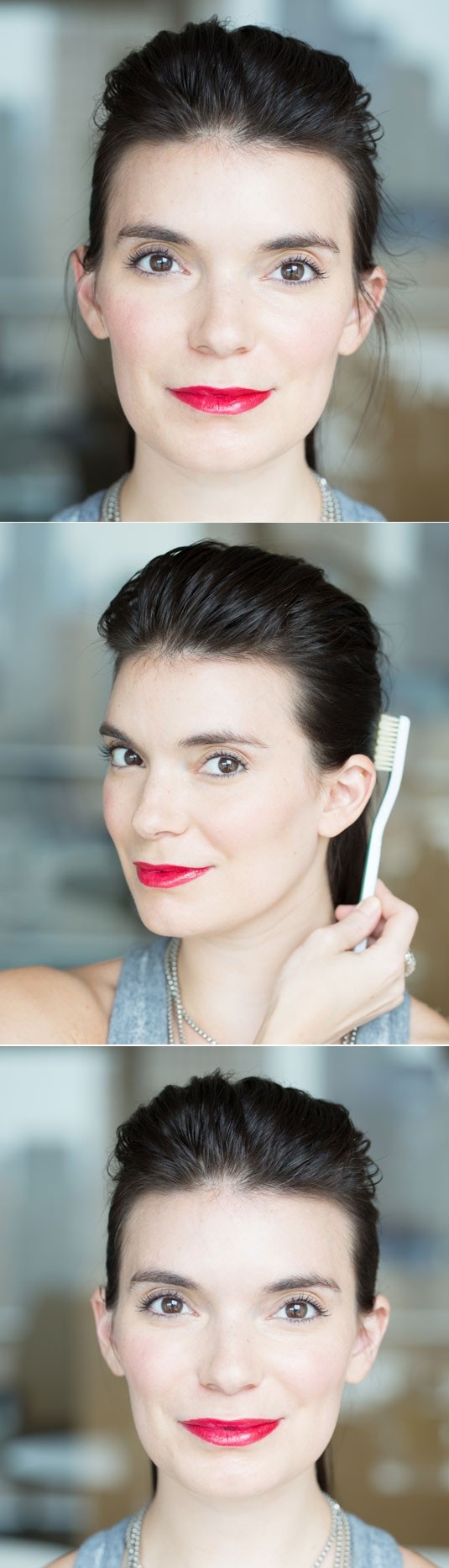 1. Chải cho tóc con nằm gọn: Vì lông bàn chải khá dày, chúng giống như chiếc bàn chải tóc lông mềm. Bạn xịt keo lên đầu lông bàn chải rồi chải lên tóc để tất cả những sợi tóc con đều nằm một cách có trật tự.