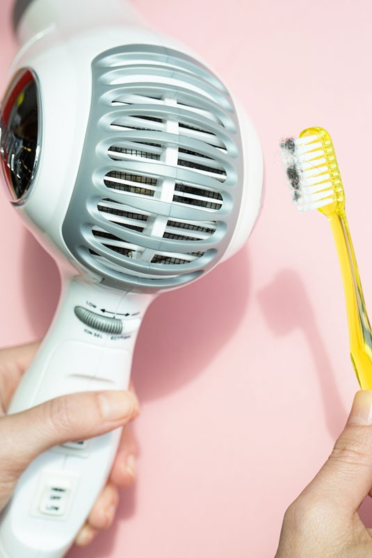 5. Vệ sinh máy sấy tóc: Bụi và lông kẹt vào cánh quạt của máy sấy tóc sẽ khiến máy hoạt động yếu đi. Hãy dùng bàn chải đánh răng để lấy chúng ra nhanh hơn.